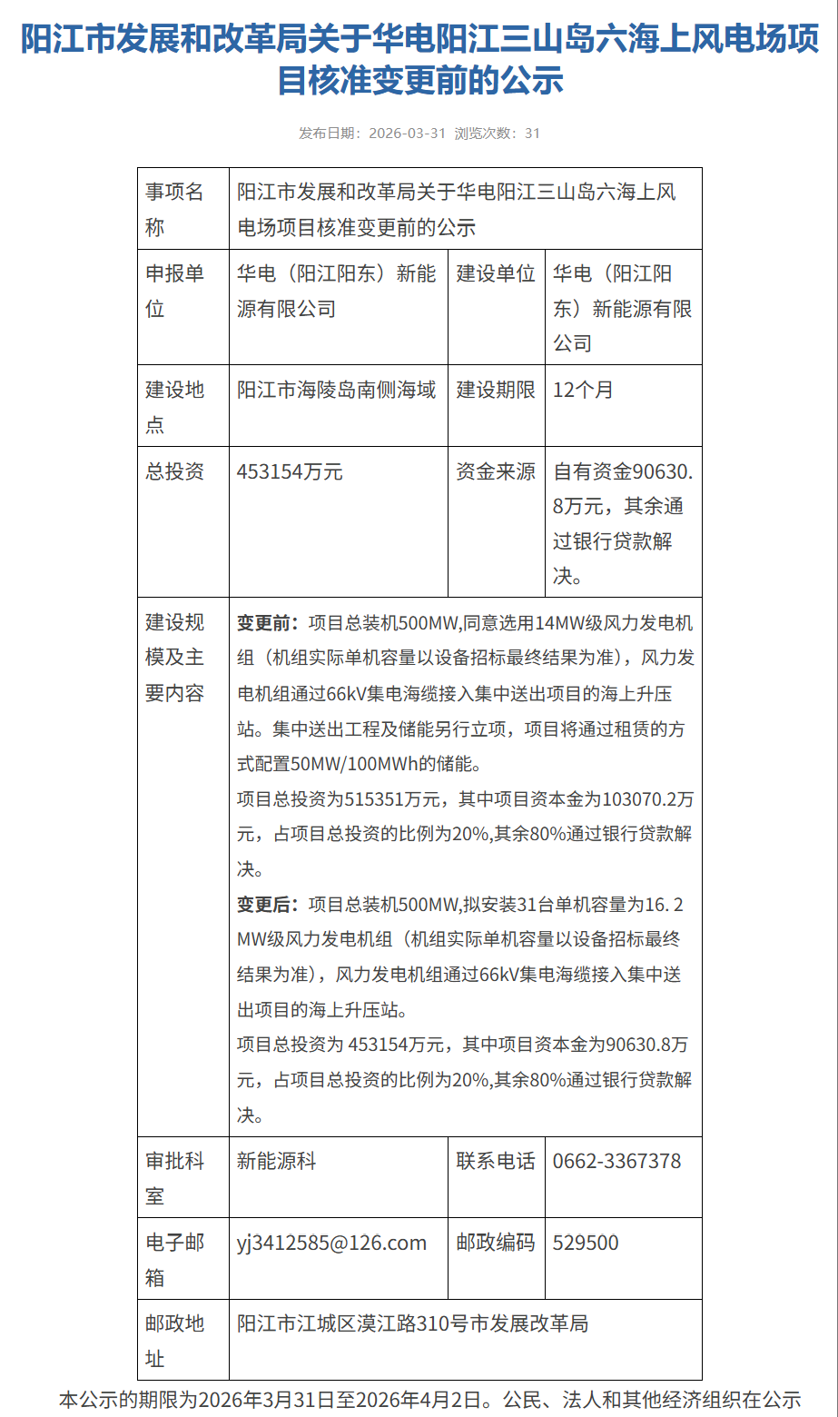 3月31日,阳江市发展和改革局发布《关于华电阳江三山岛六海上风电场项目核准变更前的公示》。