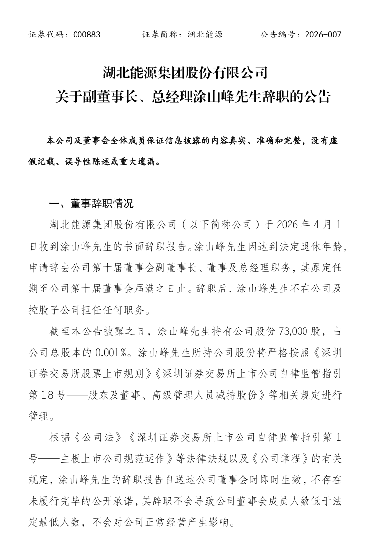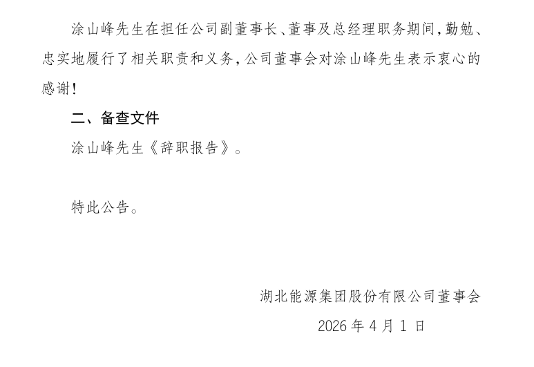 湖北能源发布公告称,公司于4月1日收到涂山峰先生的书面辞职报告。涂山峰先生因达到法定退休年龄,申请辞去公司第十届董事会副董事长、董事及总经理职务,其原定任期至公司第十届董事会届满之日止。辞职后,涂山峰先生不在公司及控股子公司担任任何职务。