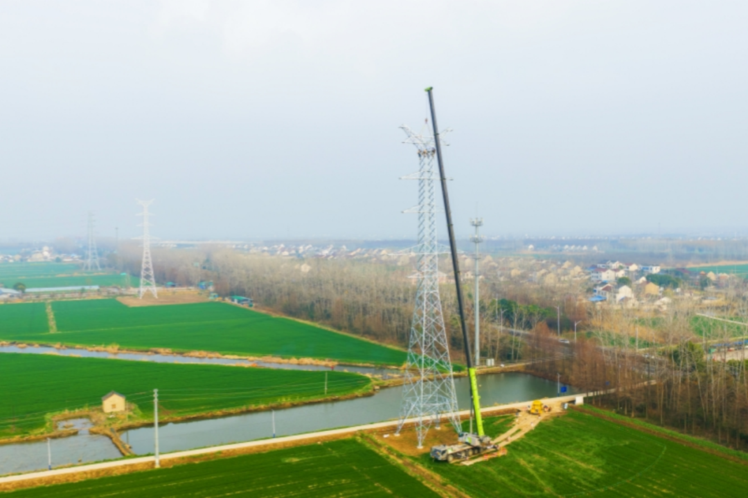 ▲国网江苏南京供电公司员工在宁北—肖山开断π入丰北220千伏线路工程现场组立铁塔