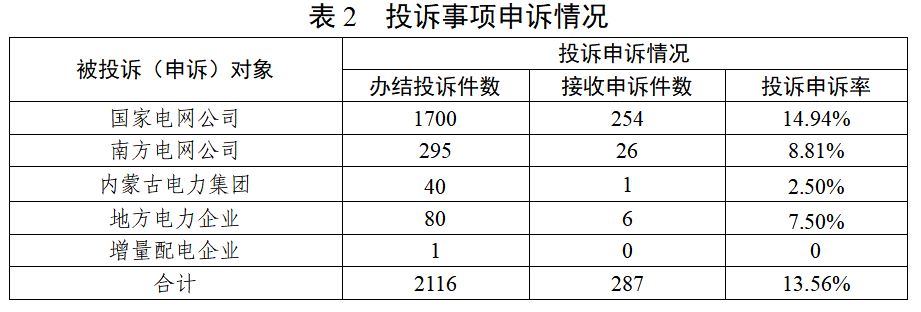 2026年3月,办结投诉事项2116件(含上月结转),热线平台接收申诉事项287件,投诉申诉率13.56%,从申诉内容看,主要集中在用电报装、线路安全、电表计量等方面(详见图2)。其中,涉及国家电网公司254件、南方电网公司26件、内蒙古电力集团1件、地方电力企业6件(详见表2)。
