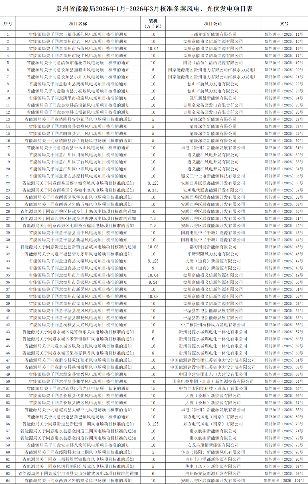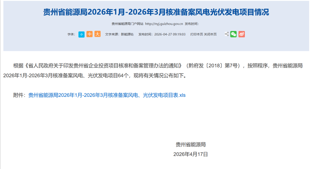 4月27日,贵州省能源局公布2026年1月-2026年3月核准备案风电光伏发电项目情况。根据披露,贵州省能源局2026年1月-2026年3月核准备案风电、光伏发电项目64个,共计580.23万千瓦,其中风电63个、565.23万千瓦,光伏1个、15万千瓦。