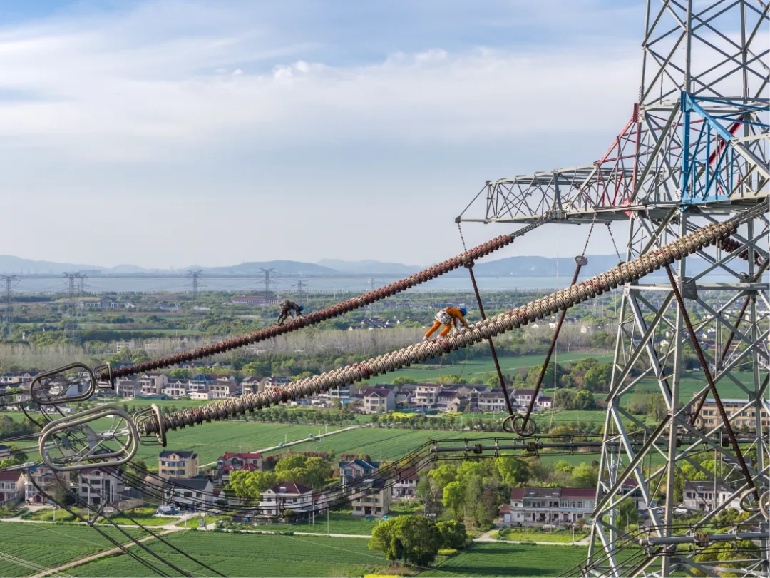 ▲国网江苏电力工作人员对锦屏—苏南±800千伏特高压直流输电工程线路开展年度检修
