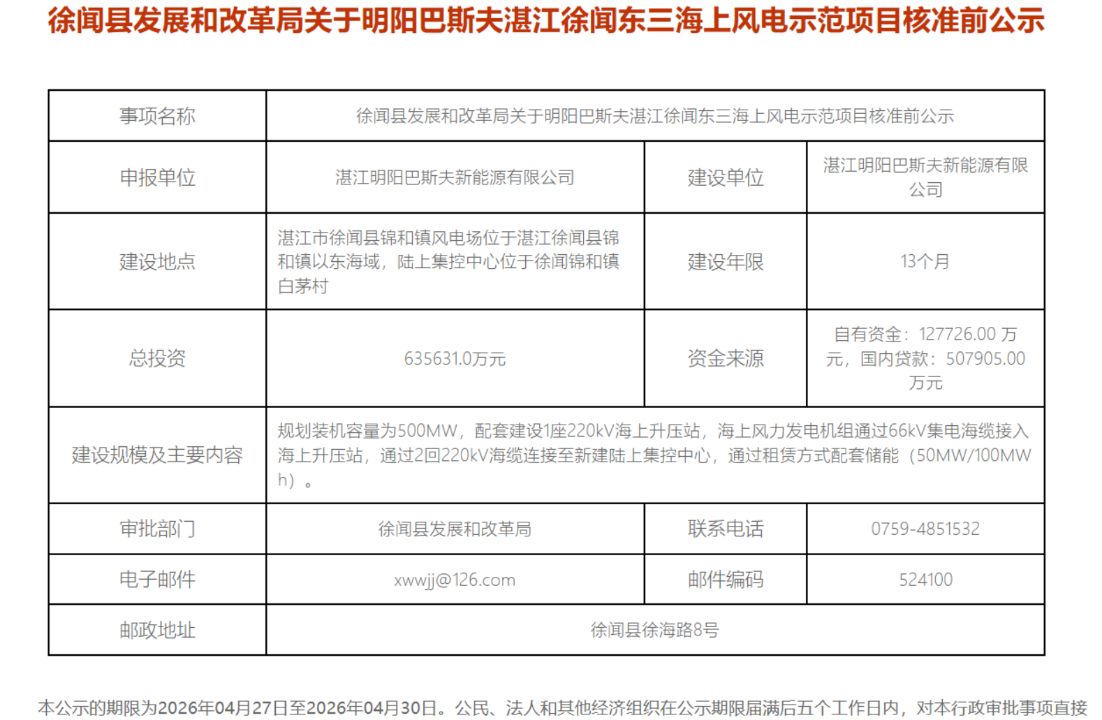 4月27日,广东省徐闻县发展和改革局发布《关于明阳巴斯夫湛江徐闻东三海上风电示范项目核准前公示》。