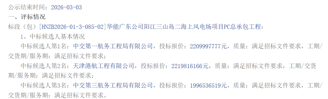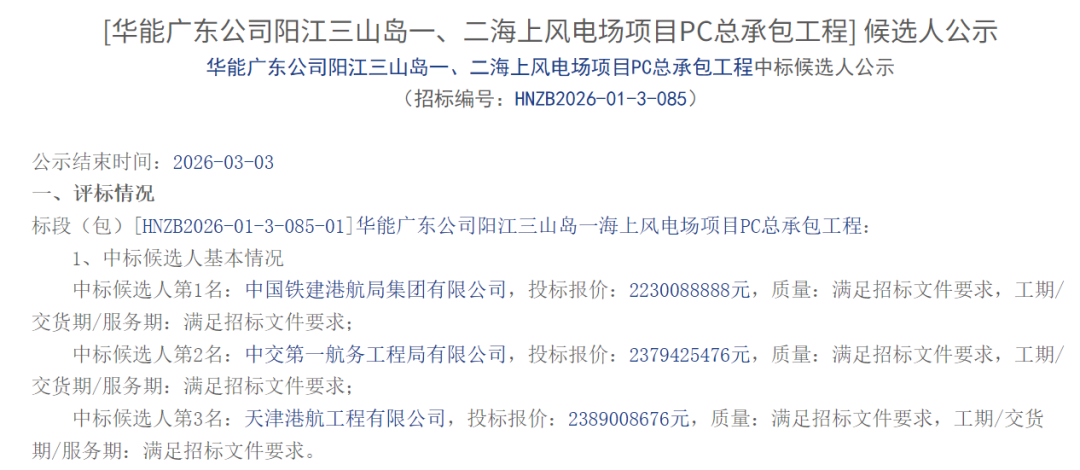 根据公告,中国铁建港航局集团有限公司为华能广东公司阳江三山岛一海上风电项目中标候选人第一名,投标报价2230088888元。