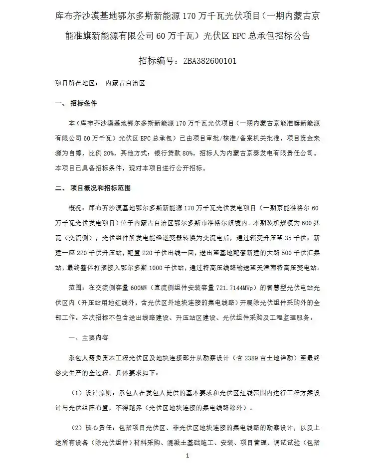 3月10日,库布齐沙漠基地鄂尔多斯新能源170万千瓦光伏项目(一期内蒙古京能准旗新能源有限公司60万千瓦)光伏区EPC总承包中标候选人公示: