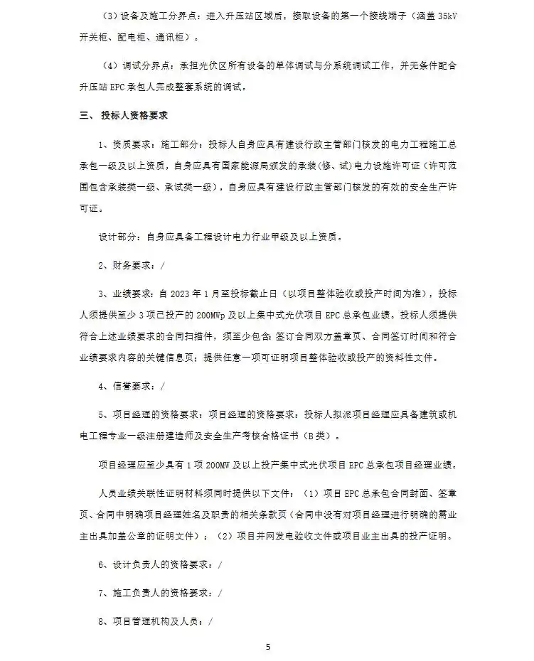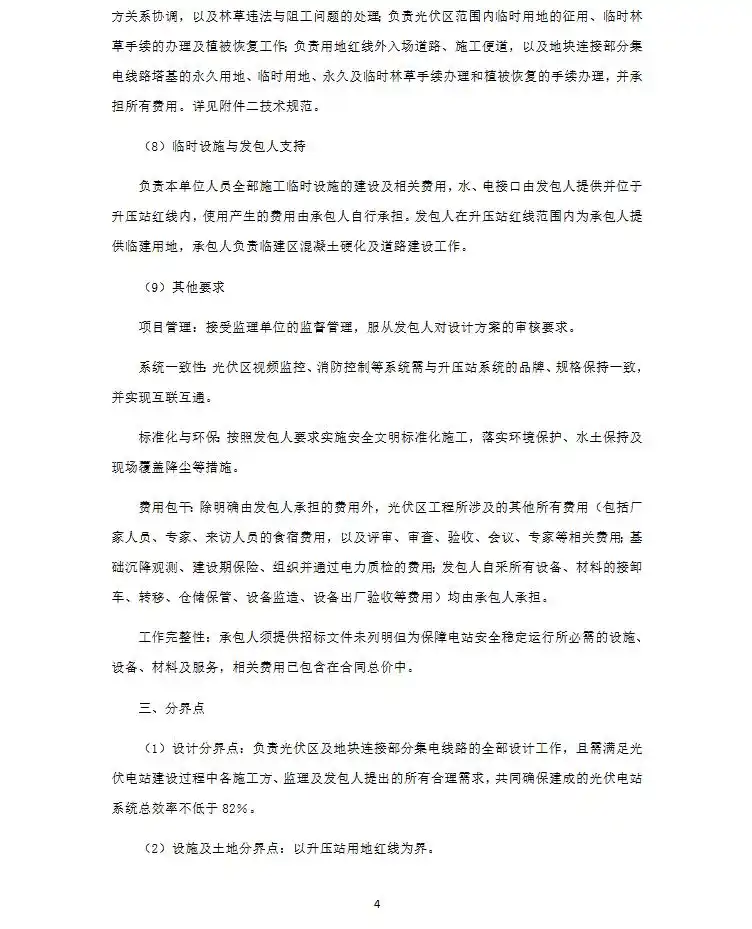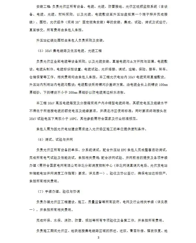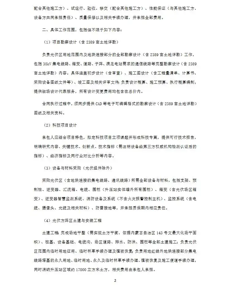 范围:在交流侧容量600MW(直流侧组件安装容量721.7144MWp)的智慧型光伏电站光伏区内(升压站用地红线外,含光伏区外地块连接的集电线路)开展除光伏组件采购外的全部工作。本次招标不包含送出线路建设、升压站区建设、光伏组件采购及工程监理服务。