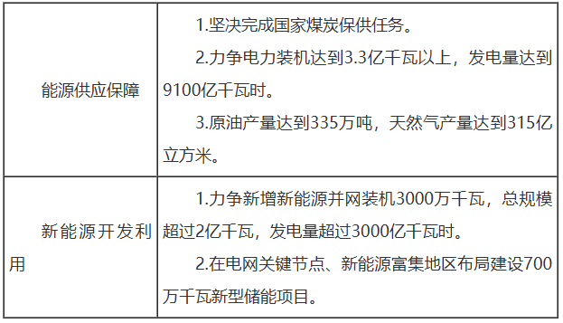 (一)持续夯实能源供应保障基础。科学谋划煤炭开发布局和产能稳定接续,煤炭产量稳定在12.5亿吨以上。推进新型电力系统建设,深入实施电网强网工程,加快蒙西电网智能化改造,新建20个500千伏输变电工程,研究论证阿拉善至蒙中地区特高压柔性直流输电线路。加大油气勘探开发和增储上产力度。推进现代煤化工中试基地建设,推动现代煤化工产业向高价值链延伸。