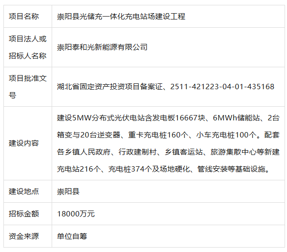 2025年12月8日,咸宁市公共资源电子交易平台对外发布崇阳县光储充一体化充电站场建设工程招标计划,该项目招标人为崇阳泰和光新能源有限公司,招标金额达18000万元,项目资金来源为单位自筹。
